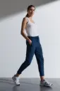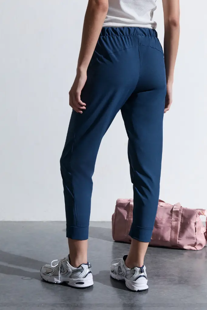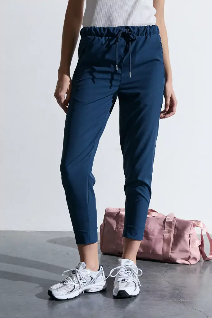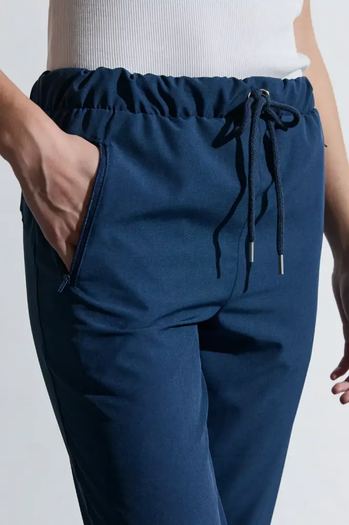 pantalon tiro medio con cordon ajustable a tono. confeccionado en tela ligeramente elastizada. bolsillos con cierre en laterales.